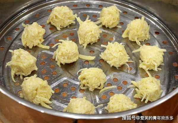 2.在蒸笼里刷上植物油防止粘锅,抓一把土豆馅在手心里团成圆球,摆放在蒸笼里面,水烧开以后上笼,盖上锅盖蒸8分钟就可以了。