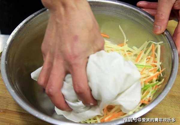3.盆中加入一勺食盐、两勺鸡精、少许胡椒粉抓拌一下,让调料均匀裹在土豆丝和胡萝卜丝上面,淋入适量的香油抓匀,以免烙制的时候食材大量出水,打入一个鸡蛋使劲地抓揉一会儿,把土豆和胡萝卜丝抓软、抓出水分,再放入一勺淀粉和150克左右的小麦面粉,把食材搅成一个粘稠的菜团即可。