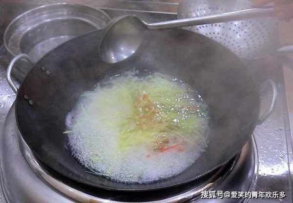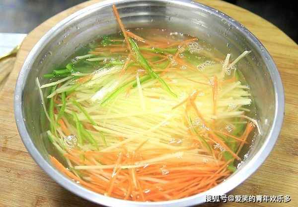 3.锅内烧水,水烧开以后先把土豆丝放入锅中,开大火焯水20秒钟,再倒入青红椒丝,继续焯水10秒钟倒出来,快速过一下凉水,以免土豆丝回软,把土豆丝控干水分倒入盆中。
