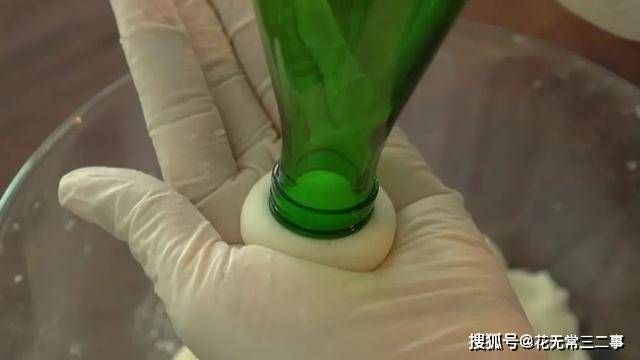 3、变成面团后,抓起一坨搓成丸子,用瓶子在表面压一下。