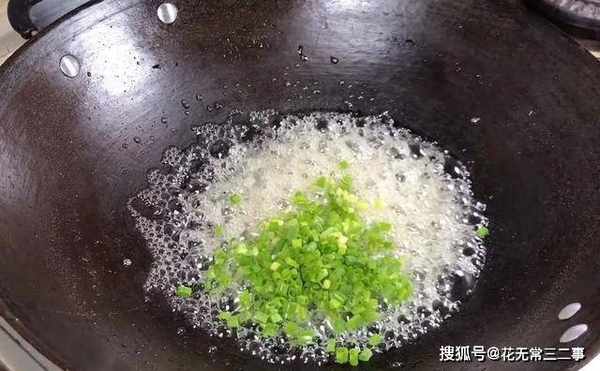 3、接着在锅中放两勺砂糖,一碗清水,煮化成糖浆,放入葱花。