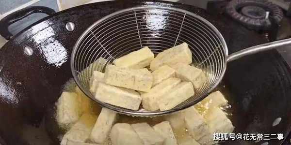 2、接着热油,倒入芋头油炸,炸3分钟,表面酥脆即可。