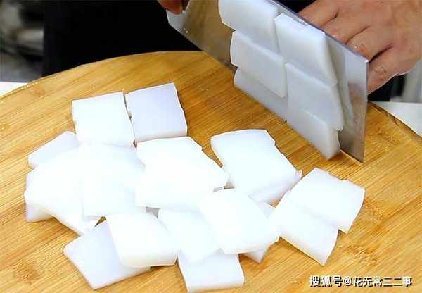 1.准备凉粉一块,从中间切成两半,再切成厚片放在盆中备用。