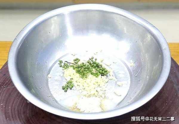 4.盆中放入蒜末、青花椒,加入适量的食盐、鸡粉调味,其他任何调料都不需要再放了,这道菜最好用橄榄油来拌,清香清润还更营养。