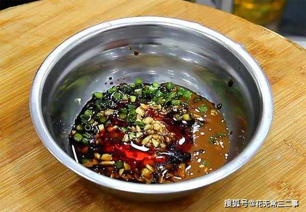 5.油烧热以后起鼓,浇在蒜末和花椒上面,把香味激发出来,再淋入一些花椒油增味,把浸泡好的蔬菜沥干水分放在调菜盆中,抄拌均匀就可以装盘上桌了。