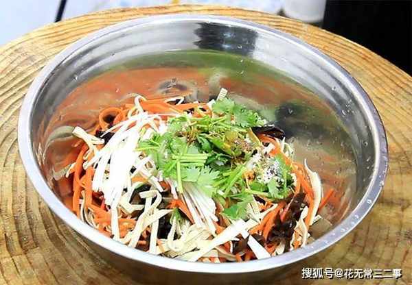 1.准备豆腐皮两张,从中间划开叠在一起切成细丝,放在盆中备用。胡萝卜半个,切成细丝。泡发好的木耳,也切成细丝,放在盆中。