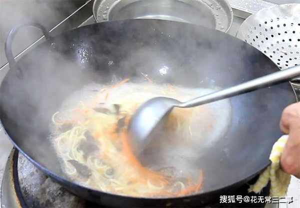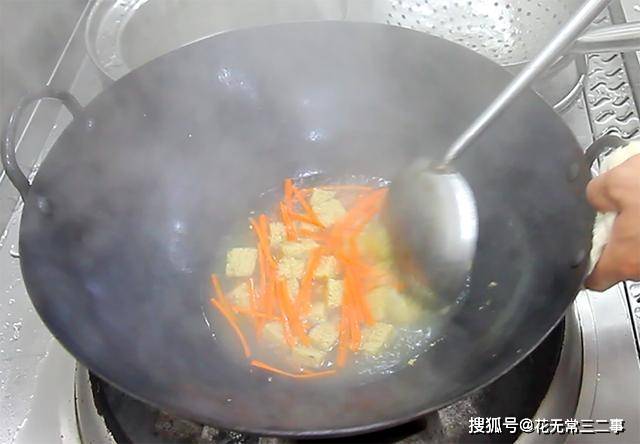 2.锅内烧水,加入一勺食盐入底味,水烧开以后倒入豆腐皮焯水10秒,再放入胡萝卜丝,最后放入木耳,全部倒出用凉水冲洗,凉水冲洗吃起来口感更脆。