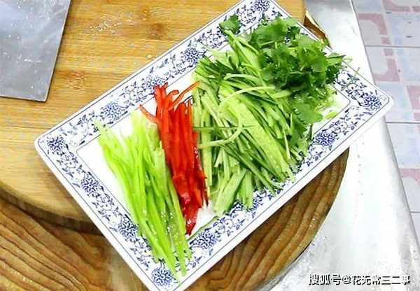 1.准备黄瓜两根,清洗干净,先切成段再切成细丝。青辣椒一个,去籽切成细丝。香菜一小把切碎备用。