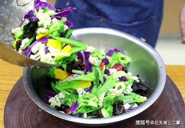 3.接着倒入西蓝花也焯烫一下,15秒钟就可以了,捞出来过凉。然后倒入木耳稍微烫一下,捞出过凉。再放入花菜、核桃仁继续汆煮至开锅。红椒片、黄椒片也快速汆煮一下。食材全部焯烫过以后一定要用清水快速冲洗过凉,以免在余温下回软、变色。