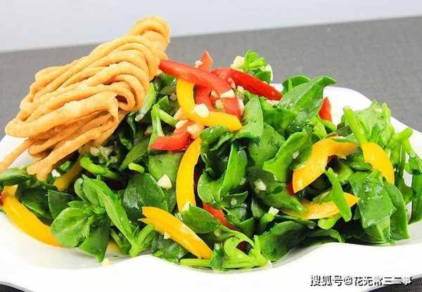 1.准备田七260克,择去老叶,留下嫩叶放在盆中清洗干净。大蒜拍扁剁成蒜末,红椒和黄椒各一片,切成辣椒丝放在盆中。炸好的馓子100克,放在盆中备用。