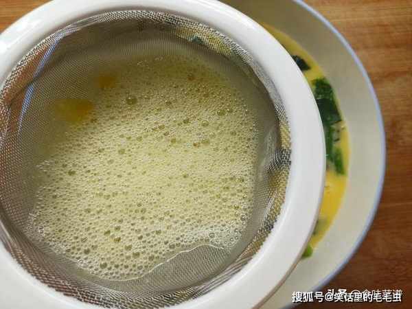 鸡蛋液倒入菠菜中,必须用过滤一遍,蒸出的鸡蛋羹也平常滑嫩。