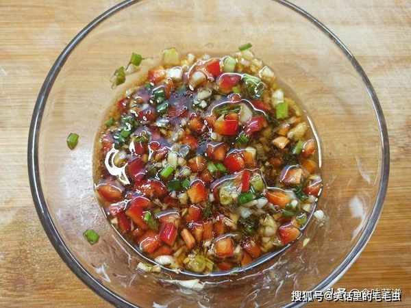 6、期间调个料汁,大蒜拍扁,切成碎末,一小块红椒,小葱,也切成碎末,爱吃辣的可替换一下,