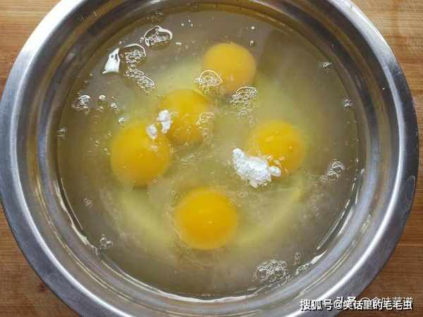 2、准备一个空盆,打入5个鸡蛋,加适量的凉开水和少许淀粉,加水后口感更滑嫩,加淀粉可更易成型,充分搅成鸡蛋液,再加2克盐入味。