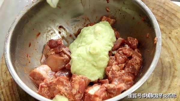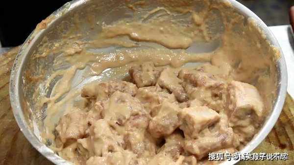 5.2个小时以后打入一个鸡蛋抓匀,放入一把玉米淀粉,继续朝同一反向搅拌均匀,淀粉能够锁住排骨中的水分,使口感更滑嫩。