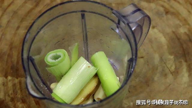 3.准备大蒜一把,生姜一块,大葱一段切开,放入榨汁机中,加入少许清水,打成蒜蓉。