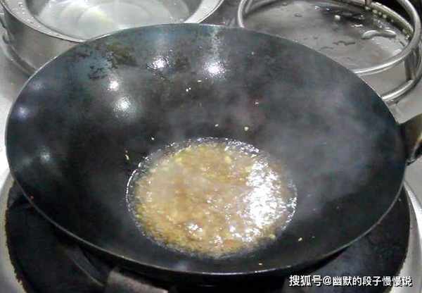 4.锅内烧油,油温五成热时倒入蒜末,开小火爆香,火要小一点,不要把蒜末变黄,闻到蒜香味以后沿锅边加入半勺清水,倒入准备好的料汁,大火烧开以后勾入少许水淀粉。