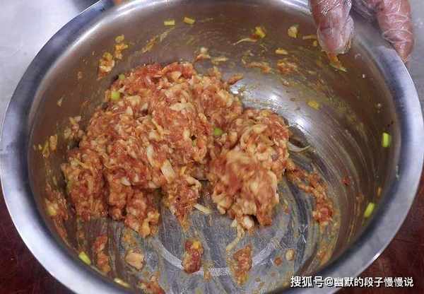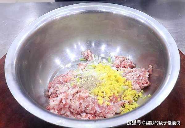 1.准备一块五花肉,去除肉片后先切成片再剁成肉末,剁好以后放入盆中,大葱破开切成葱花,生姜切成末,和肉末放在一起,加入食盐3克,鸡精2克,胡椒粉2克,生抽10克,香油5克。