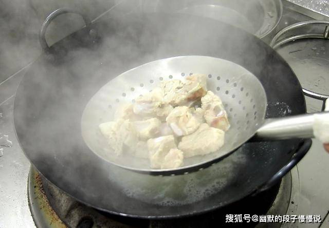 2.锅内烧水,倒入一勺料酒,凉水下入排骨,水开后焯水2分钟,沿锅边打去浮沫,排骨焯好以后捞出来速用清水冲洗,清水冲洗能进一步洗去排骨上面的杂质。