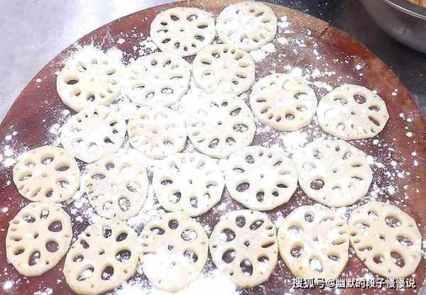 3.准备两节莲藕,把外皮削干净,切成和硬币差不多厚的藕片,在藕片上均匀撒上淀粉,增加藕片的粘合力。