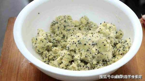 2.家里有猪油的也可以放一点,更加香酥,打入一个鸡蛋,放入白糖60克,喜欢吃甜一点的,糖可以多放一些,再放入适量熟的黑芝麻,用手把所有的原料掺匀,揉成松软的面团,用锅盖盖住松弛10分钟,方便一会拉伸整形。