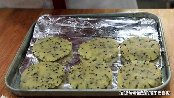 3.面团松弛好以后,我们揪下来一小块面团,在手心里团成圆球再压成小饼,就这样一个一个的做好,放在烤盘里面,这种酥饼其实非常简单,掌握好面和油的比例很轻松就能做好。