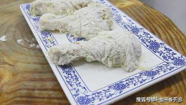 然后把鸡腿裹满面糊,在放倒刚才兑好的面粉里,裹好面粉。