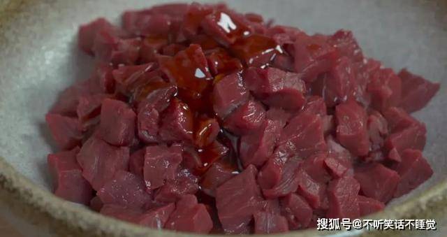 1、准备一块牛肉,清洗干净,切成牛肉粒,放碗中,加食盐、生粉、耗油、生抽腌制提味。再放一个鸡蛋搅拌,可以让牛肉粒变得嫩一些。