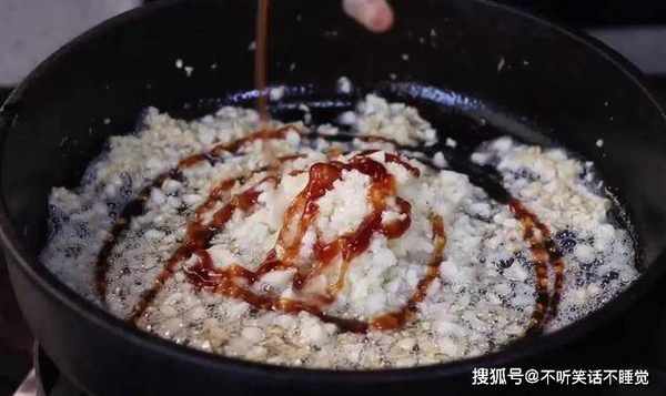 2、接着准备蒜香酱料,大蒜剁碎成蒜末,锅烧热,放油,倒入蒜末,炒出香味,微微泛黄后关火。接着放食盐、耗油等,搅拌均匀,蒜香酱料做好了。