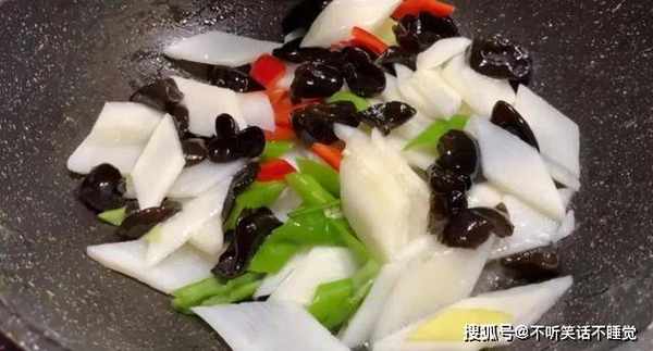 3、锅中热油,放入蒜末爆香,加入青红辣椒翻炒半分钟,接着加入山药、胡萝卜和木耳,再添加食盐、淀粉水、味精炒匀,收汁后起锅。