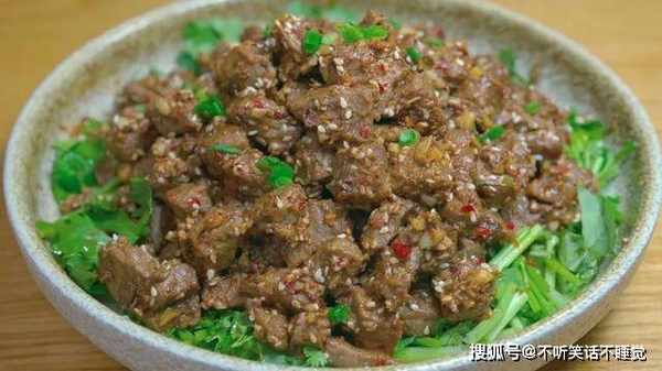 4、将炒熟的牛肉粒倒在香菜上面,这道孜然牛肉就完成,口感香嫩不柴,入味下饭,做法也很简单。