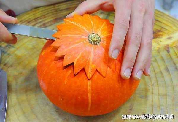 下面,做一个南瓜盅,南瓜一个,把一头切平,另一头改花刀,做成一个南瓜盖,家里没有雕刻刀的,用小刀也可以,然后用勺子把南瓜瓤挖出来,注意别把南瓜皮刮破。