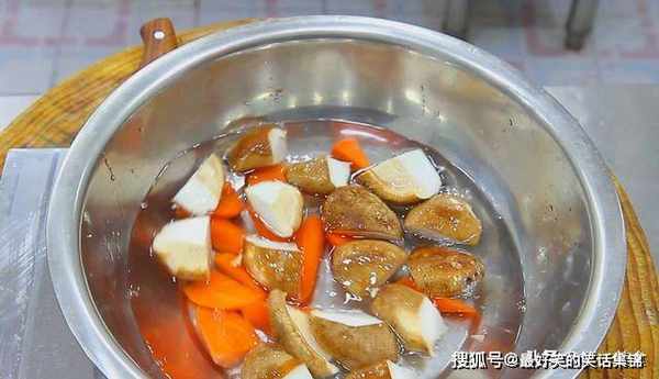 下面,我们把胡萝卜和香菇焯一下水,锅内烧水,水烧开后,倒入胡萝卜,香菇,焯水2分钟即可倒出,用清水冲洗。