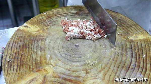猪肉一块,先去皮切成片,然后剁成肉末,也不要剁的太碎,放入盆中备用。