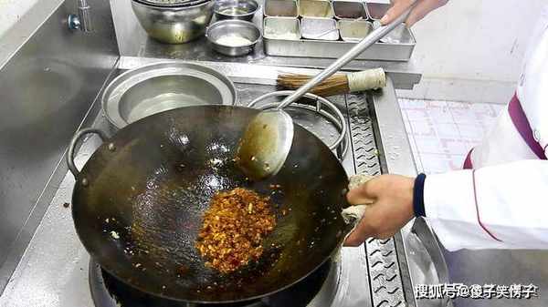 2.锅里烧油,把油烧热后充分滑锅,锅内倒入肉末,快速翻炒至变色,加入老抽,豆瓣酱,炒出豆瓣酱的红油,倒入刚才准备好的姜蒜,翻炒几下,炒出姜蒜的香味。
