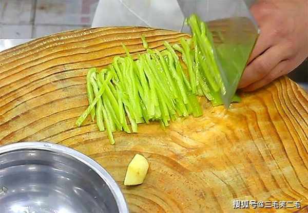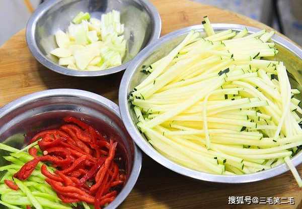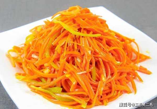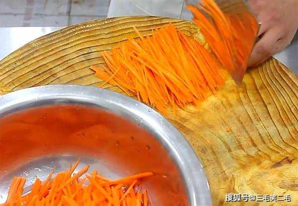 1.准备胡萝卜两根,削去外皮后冲洗一下,先切成薄片再切成细丝,切得稍微细一点放在盆里备用。