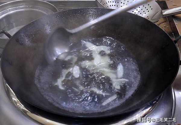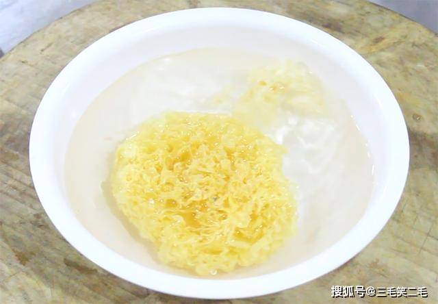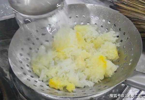 3.锅内烧开水,水烧开后倒入泡好的银耳,焯水30秒后捞出用清水反复冲洗。