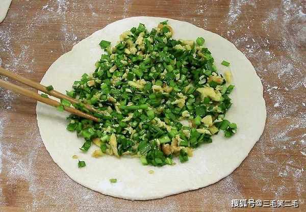6.在其中一张擀好的面皮上面,均匀地摊上韭菜鸡蛋馅,注意不要把馅摊在面皮的边缘,那样馅在煎饼的过程会跑出来,两张面皮也不容易粘在一起了。