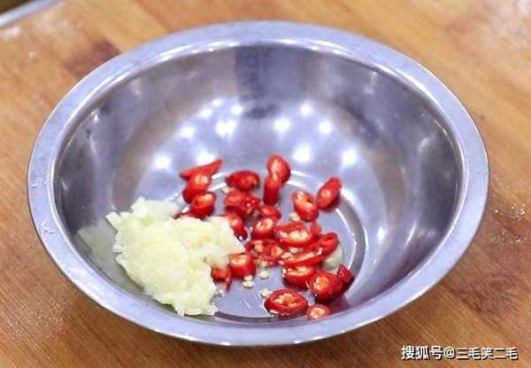 4.准备小米椒几个,切成圈。大蒜几粒,捣成蒜泥,盛出来备用。