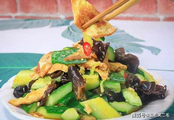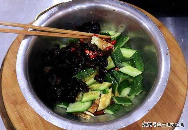 6.把煎好的鸡蛋皮切成片放入盆中,倒入黄瓜、葱油、木耳、小米椒、蒜蓉,加入一勺食盐,两勺香醋,两勺生抽,再淋入一点香油,颠盆拌匀后即可装盘。