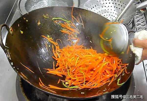 3.锅内烧油,油热后倒入葱、姜快速翻炒,再倒入青椒丝和胡萝卜丝快速翻炒,淋入一点植物油,开大火翻炒1分钟左右,勺子里加入食盐2克,鸡粉1克,接一点清水化开调料,倒入锅内,加入清水更容易化开调料,翻炒片刻以后倒入花椒油提味,翻炒均匀后就可以出锅装盘了。