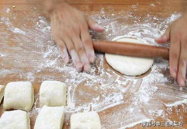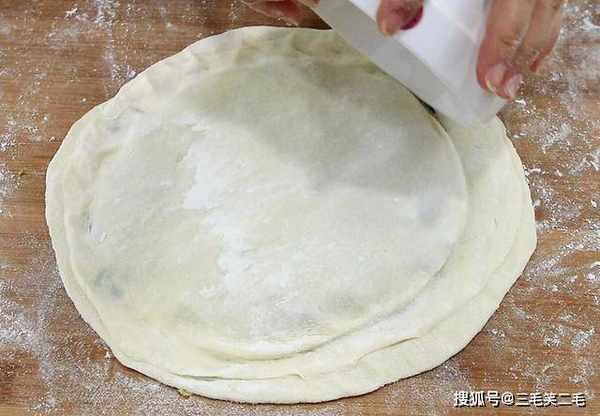 5.在案板上面撒上面粉,取出面团揉成长条,用刀切成8个等份,取其中的一份先揉成面团,再擀成薄厚均匀的面皮,擀好两张面皮以后,把其余的面团盖上保鲜膜,以防面团表面干燥。