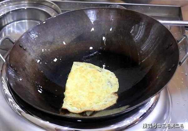 5.锅内烧油,充分滑锅以后,倒出热油加入凉油,把蛋液倒入锅中,轻轻转动锅把蛋液摊成蛋饼,沿锅边淋入少许植物油,植物油能使蛋饼自动脱离锅边,鸡蛋液全部定型以后颠锅翻面,把鸡蛋饼煎成金黄色倒出来备用。