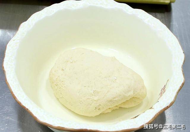 3.盆中放入精制面粉300克,把面粉从中间分开,一半用开水烫面,一半用凉水搅成面絮,稍凉以后和成面团,最后加入少许植物油和到面里,烫的面比较粘手,加点植物油比较好和,盖上保鲜膜饧面20分钟。