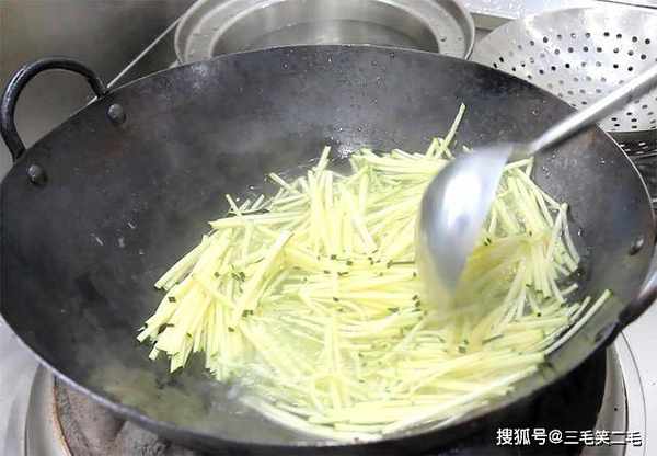 3.锅内烧水,倒出南瓜丝的水分,温水把南瓜丝放在锅中,停留几秒以后把青红椒丝放入锅中,快速地把南瓜丝焯一下水,倒出南瓜丝和青红椒丝。
