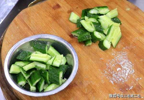 2.准备黄瓜两根,洗干净以后从中间破开,用刀背拍几下,切成小块,拍扁的黄瓜更容易入味。