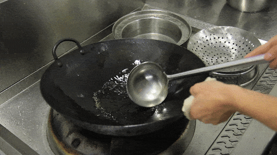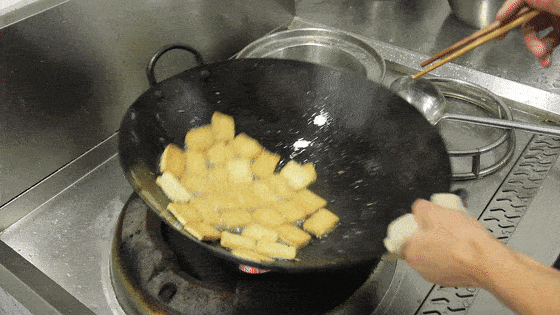 做好以上准备工作后,我们就可以开始煎豆腐了。先锅内烧油,并不停的把油浇边润锅。等到锅内冒青烟时,千万不要直接撒盐就开始煎豆腐了。应该先倒出热油并加入凉油再煎,此时热锅凉油,煎豆腐时就不那么容易粘锅了。然后才是在锅底均匀的撒上食盐,避免豆腐与锅底直接接触,造成粘锅糊底的情况。