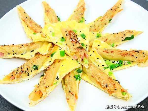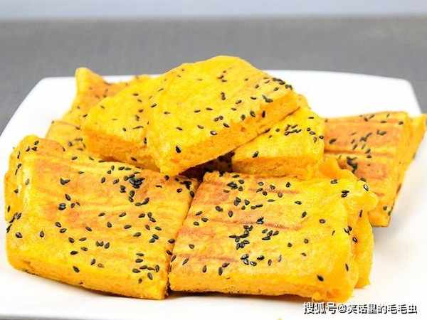 蛋液全部定型以后,在上面刷一层黄豆酱,撒上适量的黑芝麻和白芝麻,出锅切成均匀小块,摆放在盘中就能上桌食用了。