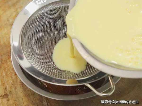 锅内加入少许清水,水烧开后放入一小把冰糖用勺子逐个敲碎,不停搅拌把冰糖化开,糖色变为红棕色即可出锅,把炒好的糖汁盛放在盆中,转动小盆让糖汁均匀铺在盆底,再在小盆周围刷上植物油,把鸡蛋倒入滤勺中过滤一下。