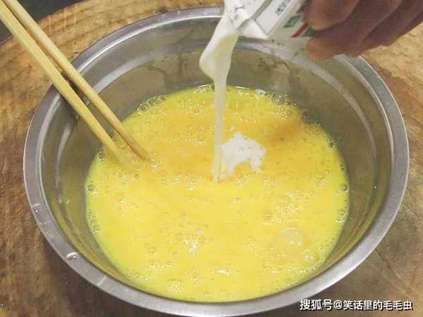 盆中打入三个鸡蛋搅拌均匀,加入纯牛奶200毫升边倒边搅动,让鸡蛋和牛奶充分融合。