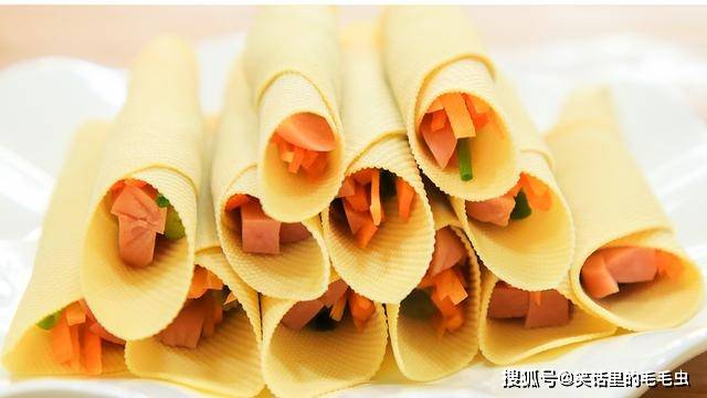 在豆腐皮上放上火腿条、胡萝卜丝、葱段,一个一个卷起来放在盘中备用。
